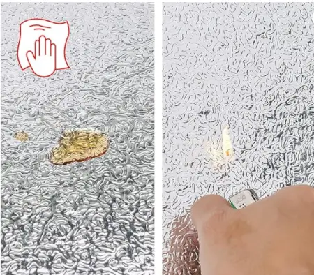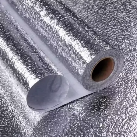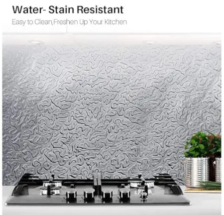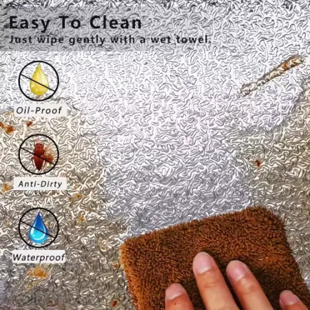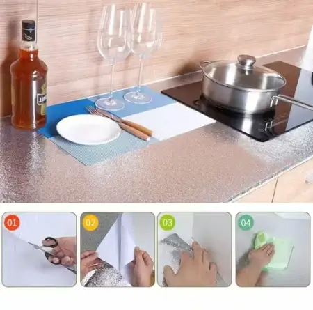 Self-adhesive waterproof aluminium foil kitchen sticker ideal for backsplash and stove walls. Heat and oil resistant.