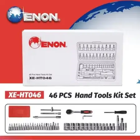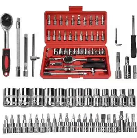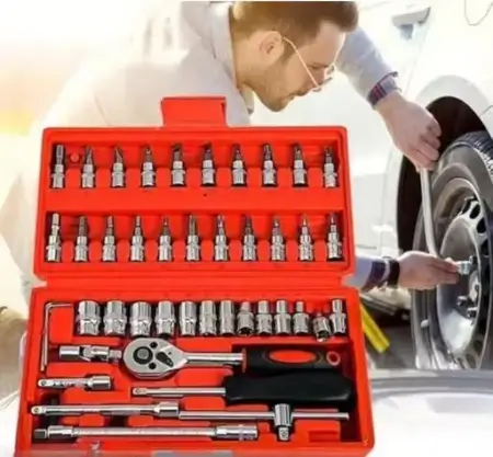 46-piece tool kit with screwdrivers, wrenches, and sockets for bike, car repairs, and DIY tasks. Includes a blow case for easy storage.