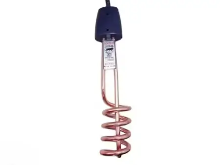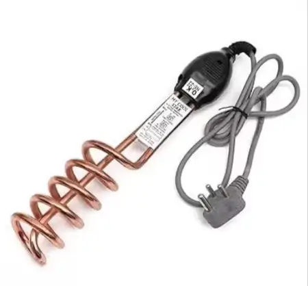 1500W copper immersion water heater in black with shockproof and waterproof design. Features ergonomic handle, corrosion-resistant element, and safety guard. Ideal for quick and safe water heating. Includes 6-month repair/replacement warranty.