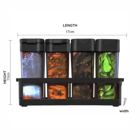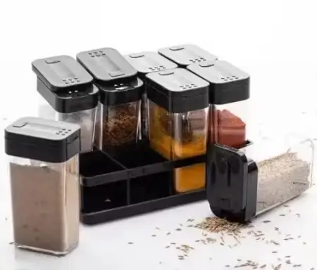8-piece airtight plastic spice storage jars with tray, transparent for easy spice identification. Ideal for kitchen organization and condiment storage… Perfect for modern homes, gifting, and premium interiors.