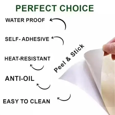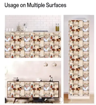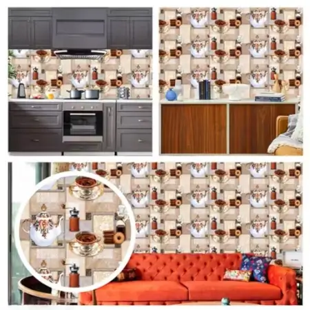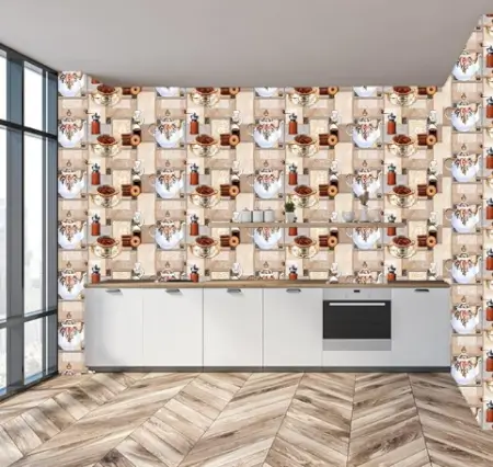 Vinyl self-adhesive kitchen wallpaper with cup and plate print. Water-resistant and easy to apply.