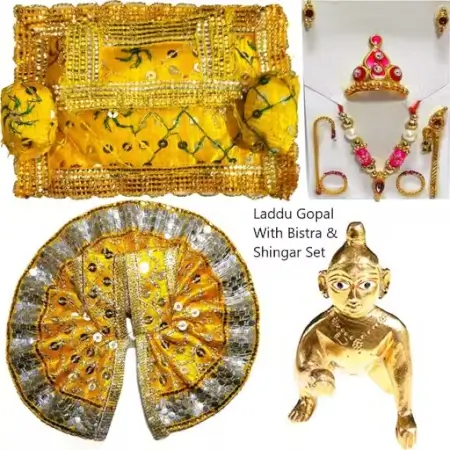 Complete shringar combo with brass idol, mukut, mala, bansuri, and asan. Perfect for daily and festive puja décor.