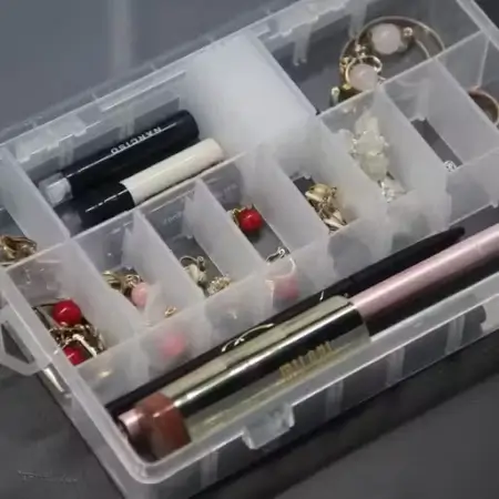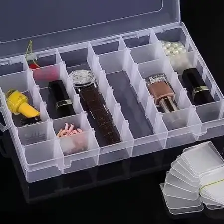 Transparent 36-grid plastic jewellery organiser box with removable dividers for storing jewellery, pins, medicines, and small items. Lockable for secu… Perfect for modern homes, gifting, and premium interiors.