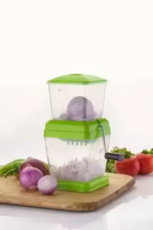 Multi-purpose manual chopper made of durable plastic with stainless-steel blades. Ideal for cutting onions, chillies, fruits, and dry fruits without tears or mess.