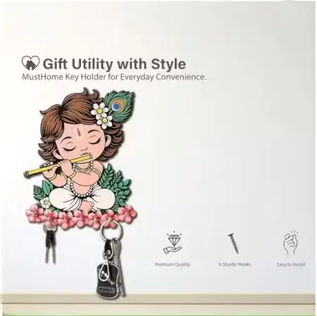 Premium wooden wall-mounted key holder set with vibrant Little Krishna design. Combines spiritual aesthetics with practical key organization for home and office.